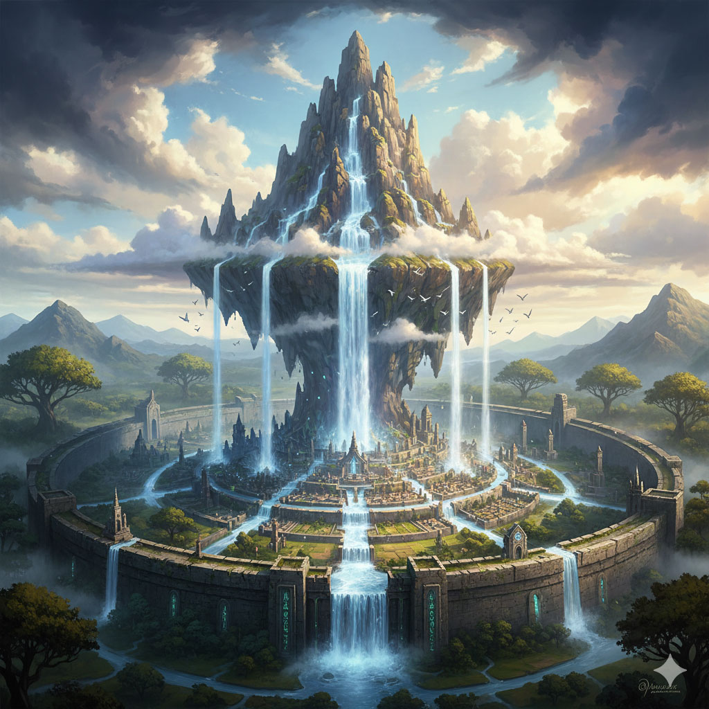 Trái tim của Aethelgard là Đỉnh Ma Phong — ngọn núi lơ lửng giữa những tầng mây tại trung tâm vương quốc. Từ đỉnh núi, một dòng thác ánh sáng đổ xuống, hóa thành nguồn nước ma thuật tinh khiết chảy len lỏi qua khắp các vùng lãnh thổ.